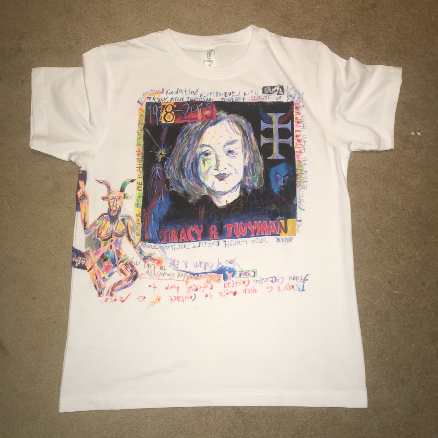 In shop, size medium tribute to Tracy Twyman. Occultist, oujia board enthusiast (she would communicate with Jean Cocteau, Cain [spawn of Adam and Eve] and the demon Baphomet), one time Boyd Rice acolyte/collaborator, author/researcher on all things hidden, occult, alchemical. Though not totally subsumed by the “truther” movement she was respected by some of its less... batshit crazy proponents. Her research into pizzagate and related conspiracies set off a chain of events that would eventually lead to her death... Rest In Peace Tracy. The cross of the Lorraine (top right) is a reference to the Ordo Lapsit Exillis which Tracy was part of in the 90’s/early thousands and nawt to do with Psychic TV.